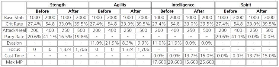 XL decided not to completely remove Parry from Strength and Evasion from Agility, because it would affect class synergies. On the other hand, Evasion was completely removed in Intelligence. To compensate this, Intelligence and Spirit gained more Cast Time than XL previously planned for.