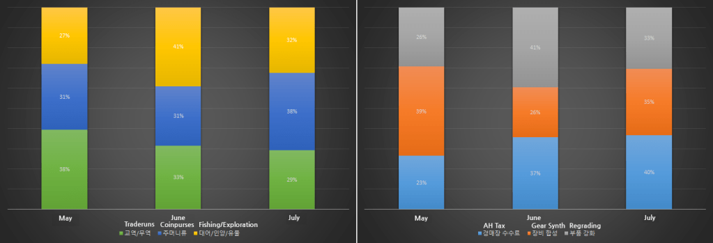 Apart from May’s “Enjoy PC cafe benefits at your home” event temporarily reducing the overall amount of gold, the overall amount of gold has rather been increasing in a fast pace. After July’s tax patch, the total amount of gold has been decreasing, but it has been recovering back to its normal rate.