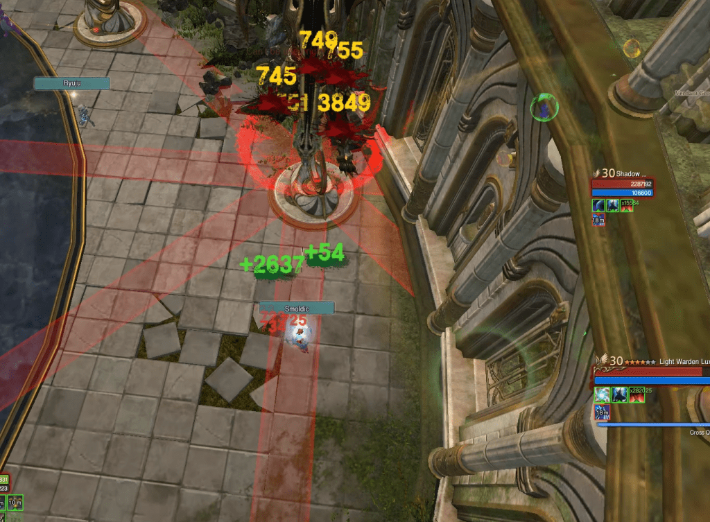 Because the boss starts with 10k shield at the start, (The video shows 50k due to it being done before the nerf.) the tanks can’t keep aggro from the healer. It’s important for the tank to use hard aggro skills like “Boastful Roar” and “Mocking Howl” to keep it from aggroing to the healer. It’s also important to make the boss face towards the wall so that it won’t accidentally hit other players.